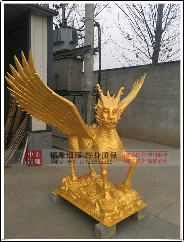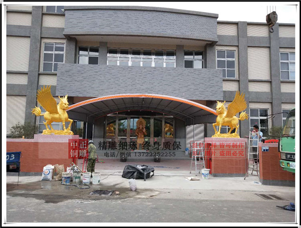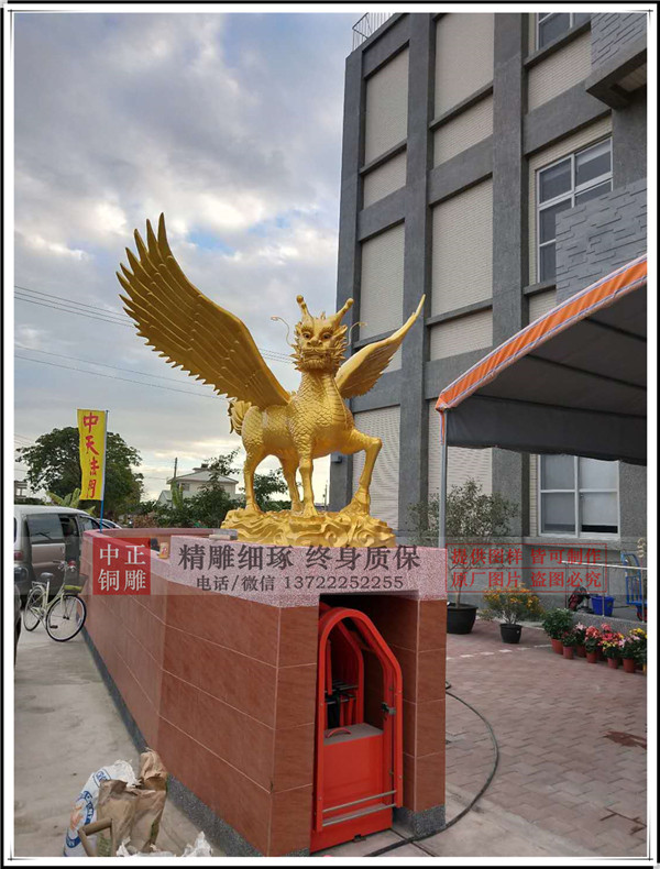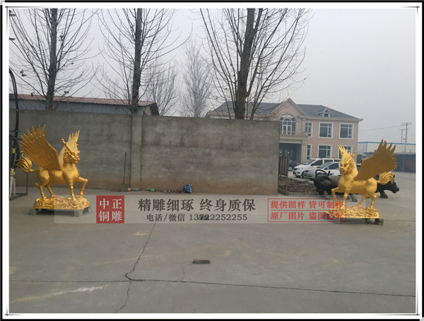 唐縣中正銅雕廠生產(chǎn)的帶翅膀銅麒麟安裝完畢