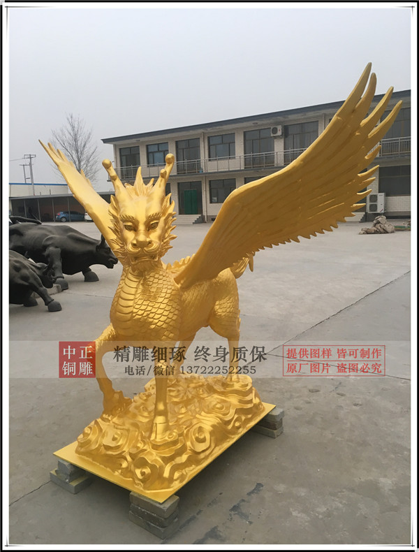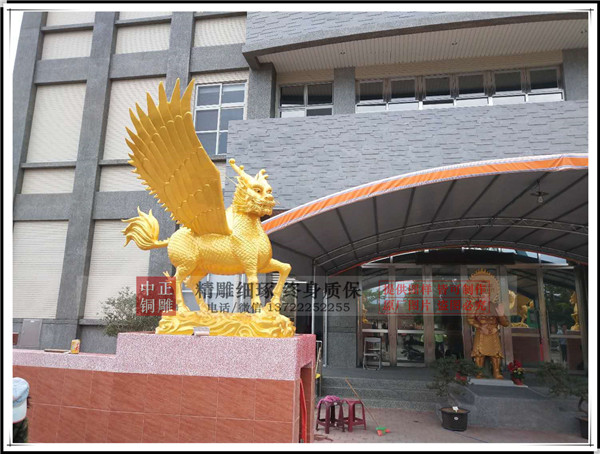 河北唐縣中正銅雕廠生產(chǎn)制作的鑄銅飛天麒麟,麒麟有臺灣客戶設(shè)計效果圖,我廠制作泥稿,開模,鑄銅。麒麟總高1.75米,底座高0.24米。鑄銅厚度8毫米。表面采用鈦金漆噴漆工藝,表面做氟碳漆保護(hù)。安裝于臺灣苗栗縣中天法門會場大門口。